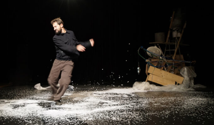 Sur le plateau de la salle du Paradis, une carcasse de bateau, plus exactement un assemblage hétéroclite d’escabeaux, de planches de bois, bidons et autres toiles de plastique évoquant un navire échoué. Un homme est là, qui chante Bonnie Dundee. Sur le sol, au milieu de flocons de neige, il découvre un nom inscrit : Gilliatt. Et Elya Birman, tour à tour narrateur et personnages, de nous embarquer dans le conte hors du temps et hors normes du poète Hugo. Le voici parti vers la haute mer, seul parmi les éléments déchainés, pour tenter de récupérer le moteur du bateau. La force d’évocation du récit prend alors une dimension stupéfiante et remplit l’espace. La mer est là, avec tous ses dangers. L’interprétation engagée du comédien donne à voir la force de la nature, des éléments, des éclairs, à entendre le maniement des outils, le grincement de la lime… Les voix off, le décor d’Estelle Gautier, les lumières de Florent Penide, la délicate création sonore de Thibaut Champagne, l’interprétation magistrale d’Elya Birman, tout restitue la puissance et le souffle hugoliens. Une performance impressionnante, à la hauteur du roman.