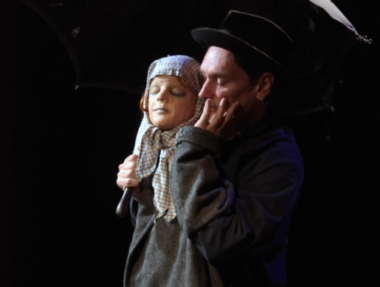Le très beau texte de Daniel Keene, court, elliptique, évoque ceux qui sont partis dans des trains et ne sont pas revenus, ceux aussi qui entament aujourd’hui d’autres voyages. « Pendant un temps, on est en vie. » La disparition, l’absence, l’oubli sont au coeur de ce spectacle pudique conçu par Alexandre Haslé « avec des marionnettes ». Le marionnettiste (qui collabora avec Ilka Schönbein) n’est pas derrière elles, mais avec elles. Il manipule les poupées de chiffon, passe des masques de papier mâché aux accessoires, aux objets, telle cette valise renfermant la maison d’Hanna.