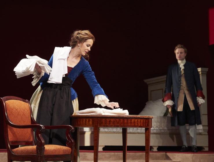 Alain Françon avait demandé une nouvelle traduction à Myriam Tanant. Pour cette spécialiste de Goldoni, disparue en février dernier, La Locandiera aura été la dernière traduction d’un auteur qu’elle admirait, et aimait. On entend ce texte clair, incisif, comme ravivé, notamment dans la partition du rôle-titre. On est à Venise, en 1752, dans une pension tenue par Mirandolina, que l’on peut voir comme une femme en avance sur son époque. Mais ce n’est pas par idéologie que Mirandolina est indépendante, c’est pour pouvoir continuer à mener, et « faire tourner » son affaire comme elle l’entend, une auberge héritée de son père, décédé quelques mois plus tôt.