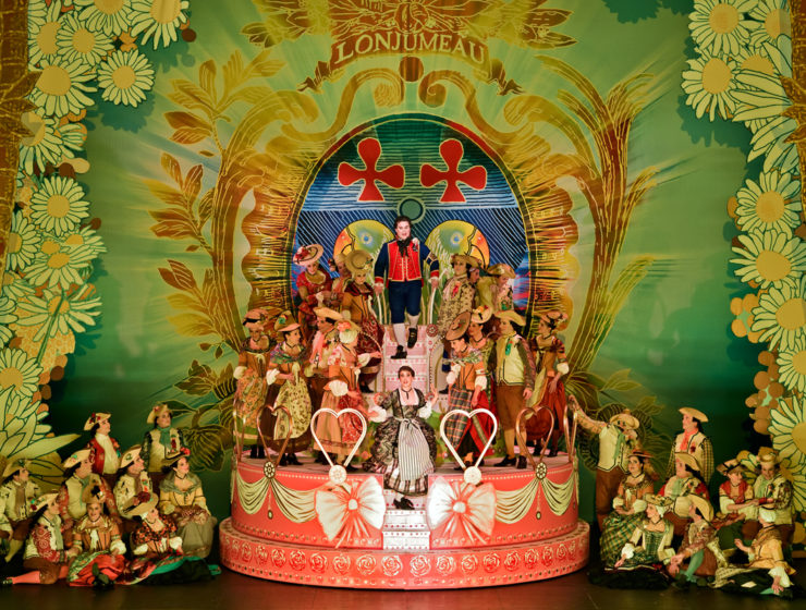 A la mise en scène, Michel Fau joue à fond la carte du kitch élégant, dès le premier acte qui voit les mariés et la noce sur un gâteau géant aux couleurs pistache et fraise. Au fil des tableaux, les décors se découvrent comme autant de pâtisseries aux couleurs saturées. Emmanuel Charles fait se succéder des toiles peintes jouant avec la profondeur et sur lesquelles s’inscrivent les éblouissants costumes de Christian Lacroix, inspirés de l’époque,
