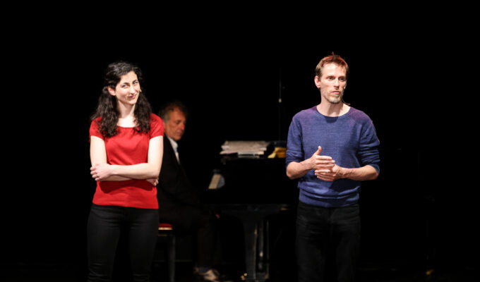 Sur le plateau, un assemblage de rails métalliques, labyrinthe de chemins hasardeux, et sur un côté, un minuscule piano et… une machine à coudre à l’ancienne d’où jaillit de temps à autre une décharge électrique. Cette machine à coudre, clin d’œil au métier de tailleur exercé par Grumberg dans sa jeunesse, dégage par ses éclairs foudroyants une force suggestive sidérante. Cette scénographie délicate et subtile, l’excellente interprétation d’Eugénie Anselin et de Philippe Fretun, les lumières de Christian Pinaud, la création sonore de Vicnet, tout concourt pour donner une aura supplémentaire au conte intemporel de Grumberg qui sait si bien manier le faux pour dire le vrai.