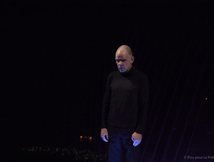Jacques Osinski fait de ce texte aride la matière d’une représentation qui relève de la performance, exécutée par un comédien et passeur de texte hors pair, Denis Lavant. Debout, immobile, bras le long du corps, il se tient. Et immobile, il restera. Pieds nus, tête penchée en direction du sol, vers un carré de lumière comme au bord d’un précipice. Celui de la page blanche, celui de la mort aussi.