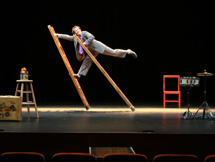 En fond musical, des notes de piano sautillantes ramènent au temps des films muets et du burlesque américain. Ici, pas de machineries compliquées. Avec peu d’accessoires, les plus élémentaires, Jamie Adkins présente des numéros simples, épurés, drôles et poétiques. Ses inventions, il les réserve à l’utilisation des objets, par exemple pour établir un échange avec le public, il propose un lancer d’oranges pas banal, avec réception directe sur une fourchette entre ses dents.